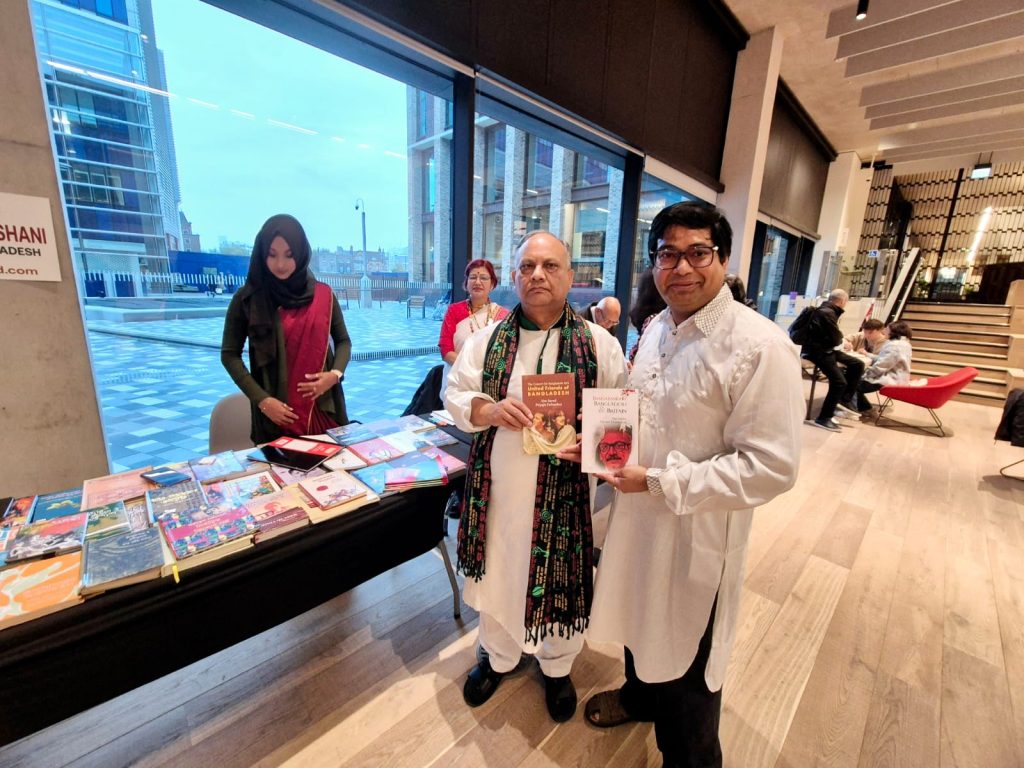 পূর্ব লন্ডনের হোয়াইটচ্যাপেল হলে অনুষ্ঠিত হচ্ছে ১৫তম লন্ডন বাংলা বইমেলা। বইমেলায় অংশ নিয়েছে বিভিন্ন স্টল। আবু সাঈদ ও প্রিয়জিৎ দেবসরকারের লেখা দ্য কনসার্ট ফর বাংলাদেশ : দুই বন্ধু এক দেশ’ ও বঙ্গবন্ধু, বাংলাদেশ অ্যান্ড বিট্রেন বইটি মেলায় পাওয়া যাচ্ছে। বই দুটি ধরে আছেন মেলার আয়োজক গোলাম মোস্তফা ও লেখক প্রিয়জিৎ দেবসরকার। ছবি: মামুনুর রশিদ